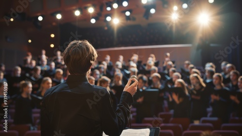 A conductor leading a choir in a warmly lit auditorium, capturing the harmony and unity of the choral performance in progress.