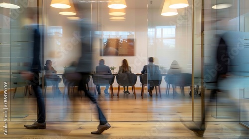 A conference room environment with professionals engrossed in a conversation, with blurred figures of coworkers passing by, indicating continuous office activity.