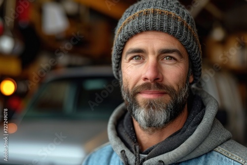A confident and cheerful elderly driver-mechanic in a stylish outfit, outdoors in a city park.