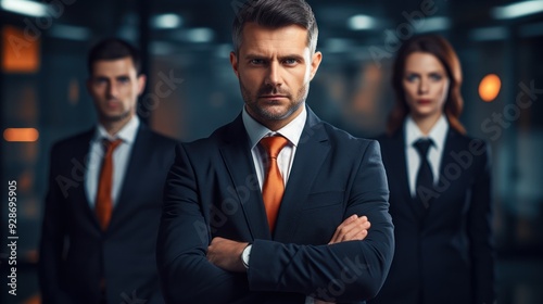 A confident businessman in a sleek suit, standing with his arms crossed,