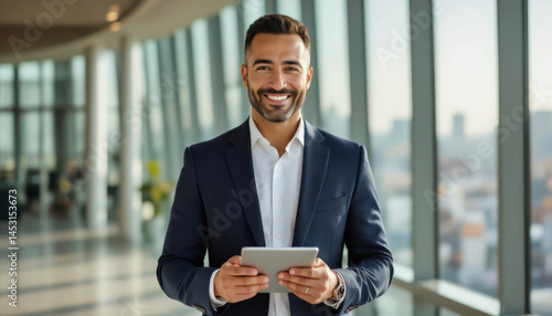 A confident businessman with a beard stands in a modern office lobby, holding a tablet and smiling at the camera with a city view behind him.