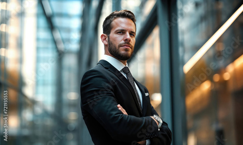 A confident businessman with folded arms stands in a modern glass corridor, looking assertively towards the camera.