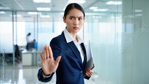 A Confident Businesswoman Displaying Assertiveness in an Office Environment, Signifying Determination and Professionalism with a Stop Gesture