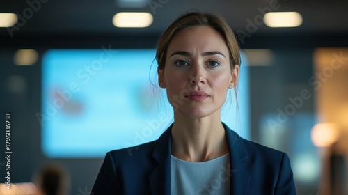 A confident businesswoman, her eyes alight with determination, addressed her colleagues in a well-lit business conference room, her presentation slides displayed on a large screen behind her.