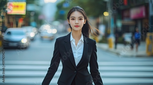 A confident businesswoman walking across a crosswalk, her professional attire sharp and her expression focused amidst the urban backdrop.