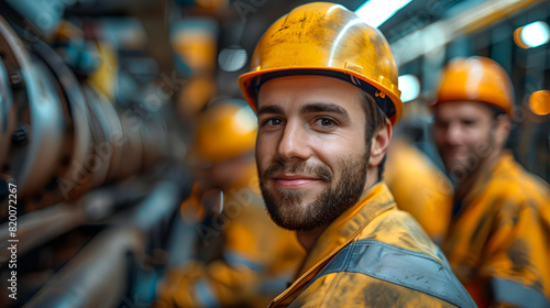 A confident Caucasian male construction worker, wearing a hardhat and protective workwear, smiling at the camera in an industrial setting