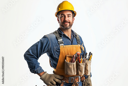 A confident contractor in safety gear poses proudly in a workshop with essential tools, showcasing his professionalism and dedication to craftsmanship