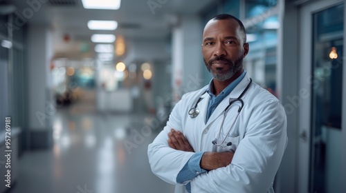 A confident doctor in a white coat stands in a modern hospital corridor with arms crossed, showcasing professionalism and dedication to patient care