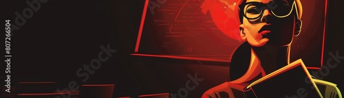 A confident female hacker wearing glasses stands in front of a large screen with a map of the world. She is looking at the camera with a serious expression.