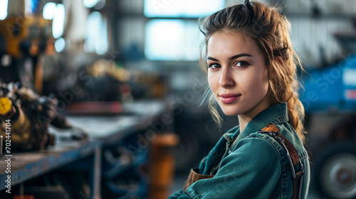 A confident female mechanic working in a garage, confident women, blurred background, with copy space