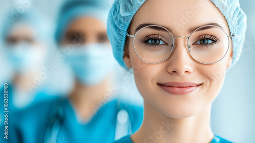 A confident healthcare professional smiles warmly, showcasing her dedication to patient care. She wears surgical cap and glasses, embodying professionalism in clinical setting