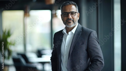 A confident Indian businessman wearing a suit and glasses, standing in a corporate office