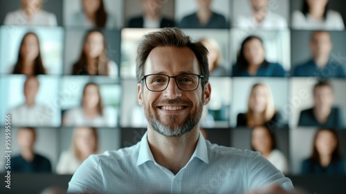 A confident man smiling, surrounded by digital faces on screens, representing teamwork and collaboration in a modern workspace.