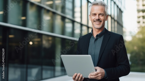 A confident middle-aged businessman wearing a dark suit standing in front of a modern glass office