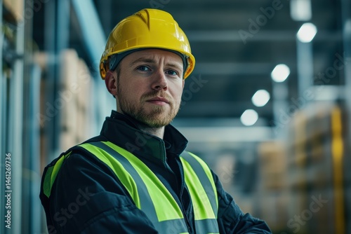 A confident safety professional stands with arms crossed in a well-lit warehouse