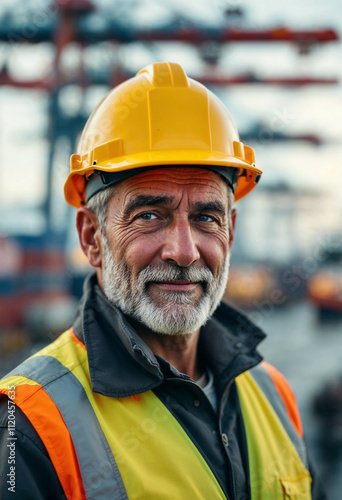 A confident seaport worker in a high-visibility vest and hard hat, with a bustling harbor backdrop.
