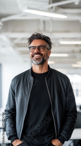 A confident, smiling hipster man wearing glasses and a black jacket stands in a modern, bright space. The background features a high ceiling and large windows.