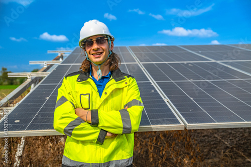 A confident solar energy technician, wearing a helmet and reflective jacket, stands with arms crossed in front of an array of photovoltaic panels, under a bright and clear blue sky.