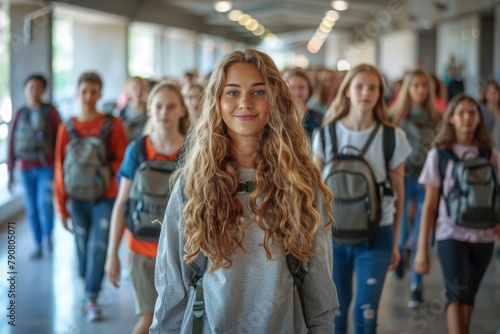 A confident teenage girl leading a group of students in a school corridor with backpacks, looking directly at the camera