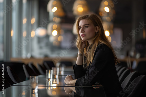 A confident woman sits thoughtfully at a conference table, contemplating her next steps in a strategic planning meeting.