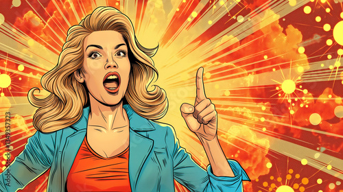 A confident woman with blonde hair passionately expresses herself against a vibrant, explosive background.