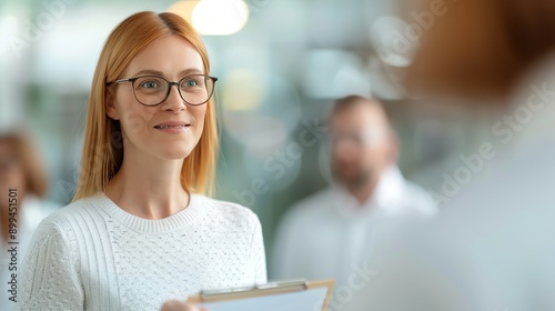 A confident woman with glasses smiles while holding a clipboard, ready for discussion in a modern office environment.