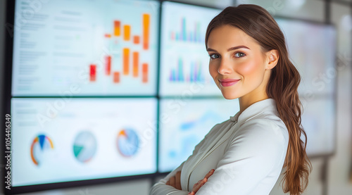A confident young businesswoman smiles in front of a large screen displaying various data charts and graphs.