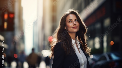 A confident young businesswoman stands in a bustling financial district, with sunlit cityscape in the background, radiating ambition and success.