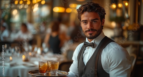A confident young waiter in a bow tie and vest serves drinks on a tray in a bustling upscale restaurant at dusk