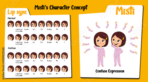 A confused cartoon girl clipart with hand gesture. Girl cartoon lip sync set for animation. Girl cartoon confused face expression. Confused cartoon girl illustration, vector, character, clipart.