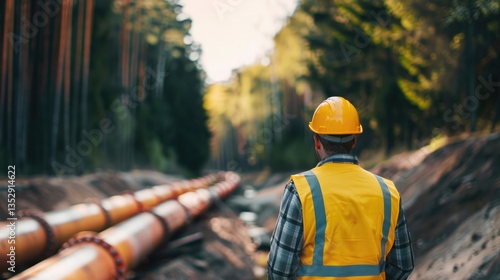 A construction engineer monitoring a water pipeline installation project in a remote area