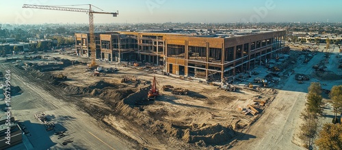 A construction site featuring a large building under development with machinery and equipment.
