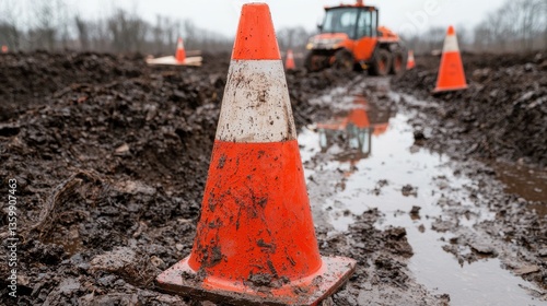 A construction site showing a muddy terrain with orange traffic cones placed around, indicating caution and ongoing work.