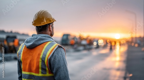A construction worker in a high-visibility vest and helmet stands in the foreground, gazing at a colorful sunset. Vehicles and machinery busy the background, signaling ongoing activity