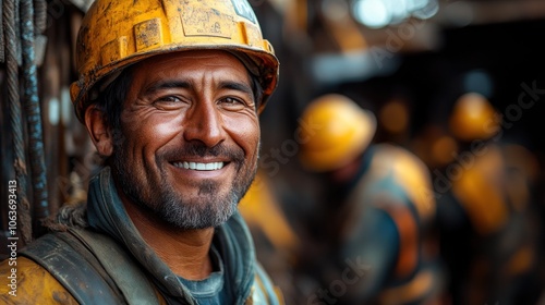 A construction worker in a yellow hard hat smiles confidently while working on a construction site.