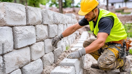 A construction worker in a yellow vest and helmet lays stones for a wall, demonstrating skill and focus on a building site.