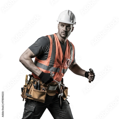 A construction worker in protective gear, holding a wrench and wearing a safety vest with reflective stripes.