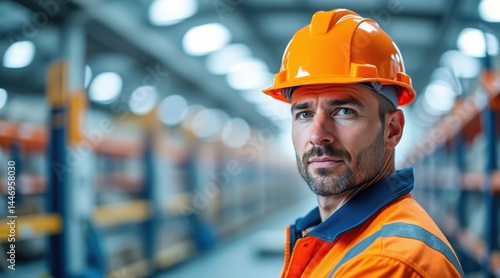 A construction worker in safety gear stands confidently in an industrial warehouse with bright lighting in the background.