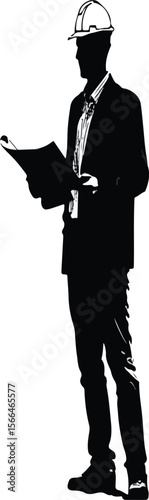 A construction worker in safety vest and hard hat looking at a blueprint on a white background