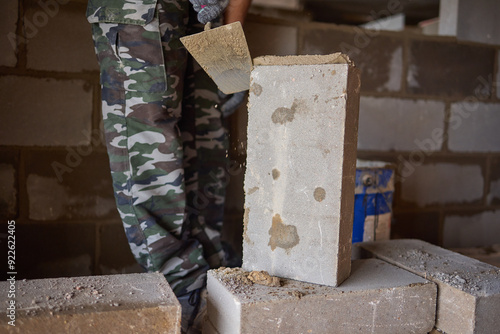 A construction worker is expertly laying cinder blocks within the ongoing building project