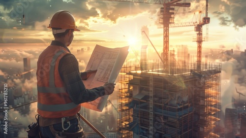 A construction worker reviews blueprints at a high-rise site during sunset.