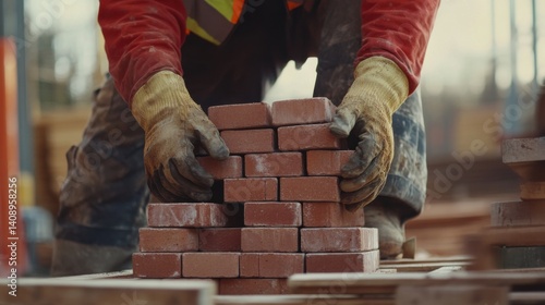 A construction worker stacking bricks on a construction site. Featuring organization and efficiency