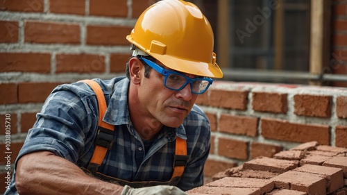 A construction worker stands against a brick wall, showcasing his hardworking spirit in a construction site environment, dressed in work attire and protective gear