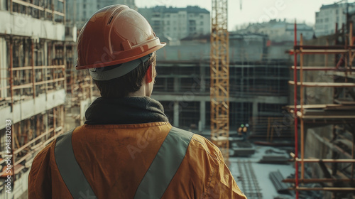 A construction worker wearing a hard hat and safety vest stands on a building site, looking at the progress of the construction. The image symbolizes safety, hard work, dedication, construction, and