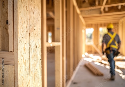 A construction worker wearing a yellow hard hat and a bright yellow safety vest, with a tool belt around the waist, walking inside a wooden - framed building under construction.