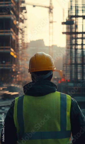 A construction worker wearing a yellow helmet and a green vest overlooking a construction site