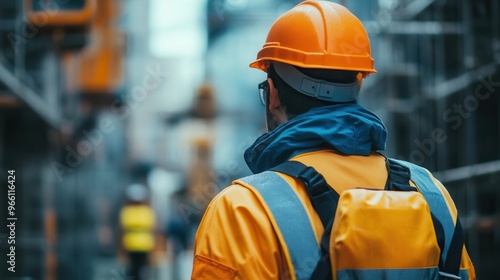 A construction worker wearing an orange helmet and reflective vest, overlooking a busy construction site with scaffolding.