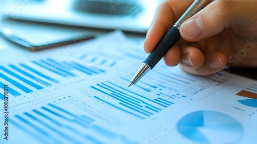 A consultant’s hand holding a pen, pointing at a detailed business report filled with charts and data, highlighting key insights during a discussion
