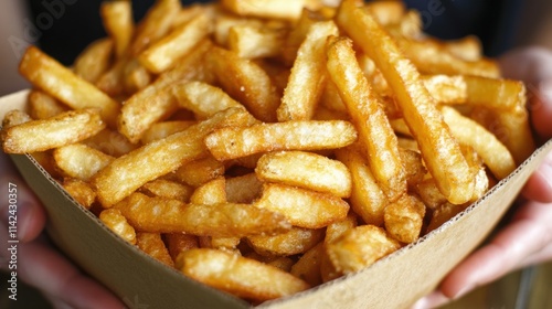 a container of golden french fries being held by two hands
