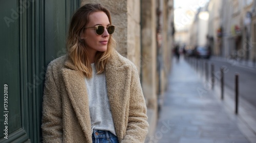 A contemplative Caucasian woman in textured coat, timeless urban explorer, channels winter solstice introspection, amidst vintage cityscape whispers